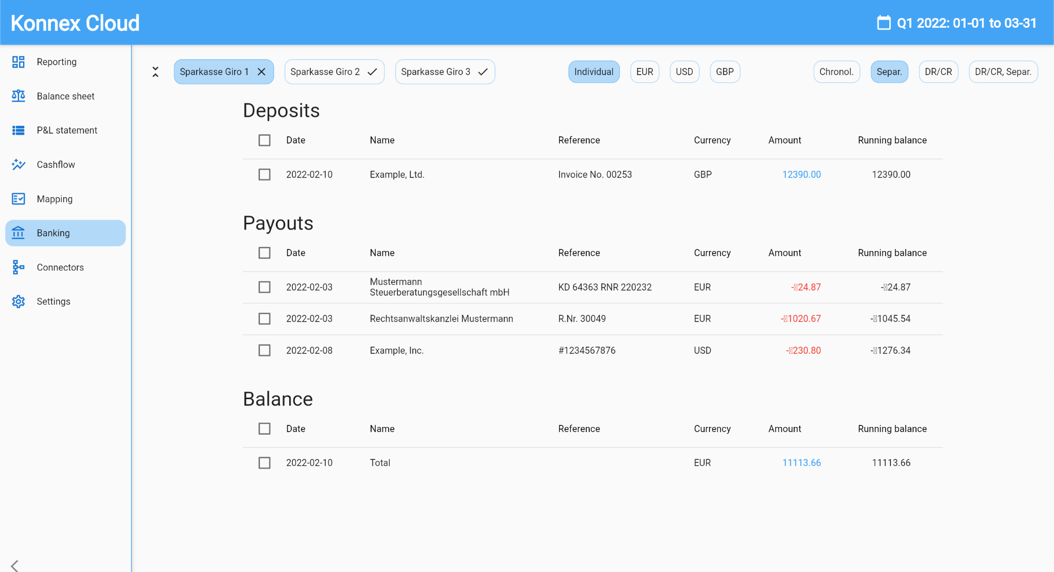Real-time financial controlling with IFRS- and HGB-compliant income statements, balance sheets, and cash flow statements, as well as group consolidation.